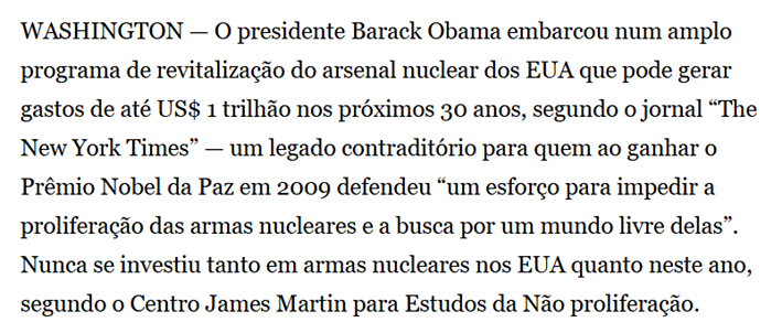 Teríamos que avaliar o que ele fez nesses 8 meses de mandato presidencial ou, antes, na sua carreira de advogado e político profissional para fundamentar a "decisão" desse comitê. Mas isso seria demasiadamente vexatório, porque ele não fez absolutamente nada. Mas talvez esse seja um comitê com poderes prescientes sobrenaturais e poderia, portanto, ter previsto ações futuras. Vamos verificar então se o Sr. Hussein Obama contribuiu nos anos seguintes à sua premiação para uma "visão de mundo livre de armas nucleares". Vejamos: