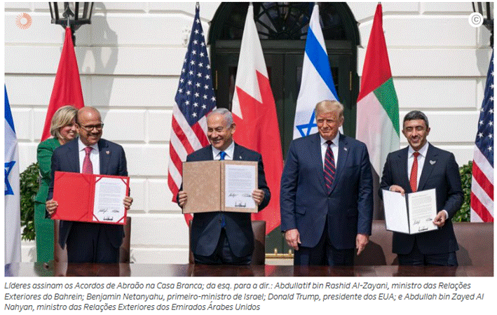 Um verdadeiro tapa na cara do líder de Israel, que não tem o costume de ser contrariado. Há também, é claro, o pedido de desculpas públicas de Netanyahu ao Catar. Quem teria o poder de forçá-lo a fazer isso? Certamente não seria o Macron nem qualquer outro palerma europeu. Fazer um judeu pedir desculpa só não é mais difícil que tirar o ouro dele. Imagine então fazer o judeu mais poderoso de Israel pedir desculpas para árabes. Parece até piada, mas aconteceu, e tem a digital do Laranja por trás. Trump quer negócios, não quer guerras. E ninguém melhor para fazer negócios do que os árabes. Não podemos esquecer dos históricos Acordos de Abraão, que foram assinados em 2020 na Casa Branca, normalizando as relações entre Israel, Bahrein e Emirados Árabes. O próprio cessar-fogo de Gaza provavelmente não teria ocorrido sem a pressão de outros países árabes sobre o Hamas.