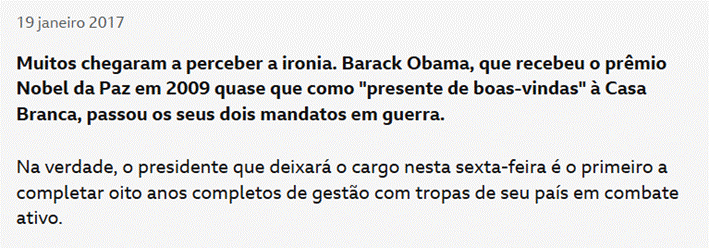 Mas o que importa para nós é que há ex-presidentes americanos que já foram laureados pelo comitê norueguês, isso possibilita a realização de uma breve análise comparatista com os feitos do Laranja. Vejamos, por exemplo, o caso do Sr. Barack Hussein Obama, que foi laureado em 2009, quando estava na posse do seu primeiro mandato há apenas 8 meses. O comitê justificou o laureamento do Sr. Hussein Obama nos seguintes termos: